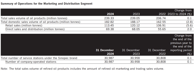 In 2024, by adapting to market changes, the Company fully leveraged its integration and network advantages, and continued to build an integrated energy service provider of petrol, gas, hydrogen, power and service. We carried forward targeted marketing tactics, expanded strategic clients base and boosted the sales volume of high-grade gasoline. We stepped up effort in gas refueling and EV battery charging and swapping businesses. Over one thousand gas-refueling stations and more than 10 thousand battery charging and swapping stations were built. Hydrogen-based traffic was promoted steadily. Meanwhile, we vigorously expanded our global presence, explored the low-sulfur bunker fuel market both at home and abroad and the total operating volume of our bunker fuel business ranked second in the world. We continued to enrich the Easy Joy service ecosystem and upgraded non-fuel business operational quality. Total sales volume of refined oil products for the year was 239 million tonnes 向日葵视频在线观看.